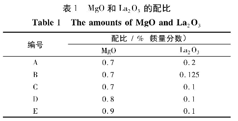 添加不同配比Mg0和La203二元復(fù)合添加劑的Al203混合粉體成型后,1600℃下燒結(jié)并保溫4h。Mg0和La203的配比如表1。