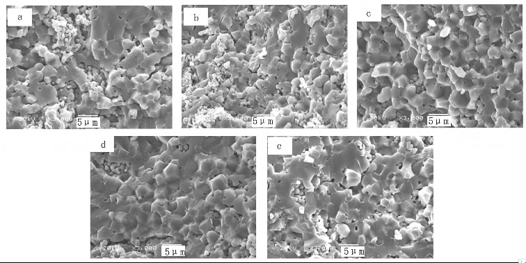圖4為Mg0和La2O3共同作用下樣品的顯微結(jié)構(gòu)。由圖4a~圖4c可以看出,隨著La2O3用量的逐漸減小,燒結(jié)體斷口晶粒尺寸逐漸減小且趨于均勻,晶粒之間的空隙減小,燒結(jié)體的致密度提高;添加0.2%La203時,燒結(jié)體的斷口出現(xiàn)晶粒異常長大現(xiàn)象,La2O3添加量為0.1%時可以得到晶界清晰、晶粒完整的斷口。減小La203用量導(dǎo)致燒結(jié)體的斷裂方式由穿晶斷裂向沿晶斷裂轉(zhuǎn)變,提高了氧化鋁陶瓷坯體的斷裂強度。La2O3可以形成液相,界面上出現(xiàn)少量的液相會形成新的固一液界面,降低界面移動的運動力、擴散距離增加,可以降低界面遷移速度,抑制晶粒的增長。局部出現(xiàn)大量液相時,晶界上形成新的固一液界面,會加快晶界的迂移速率,易發(fā)生液相包裹氣孔現(xiàn)象,形成孤立氣孔,降低燒結(jié)體的致密度。圖4c~圖4e為不同Mg0添加量樣品的斷口形貌。