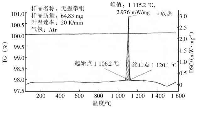 真空釬焊的關(guān)鍵工藝參數(shù)是釬焊溫度和真空度。對(duì)于釬焊溫度, 為了減少試驗(yàn)工作量、提高效率, 可對(duì)釬料先進(jìn)行熱分析, 測(cè)出熔化溫度點(diǎn), 再根據(jù)分析結(jié)果進(jìn)行試驗(yàn)研究, 較后確定釬焊溫度工藝參數(shù)。圖3為無(wú)氧銅熱分析結(jié)果, 表明該材料熔化點(diǎn)在1 115℃左右。