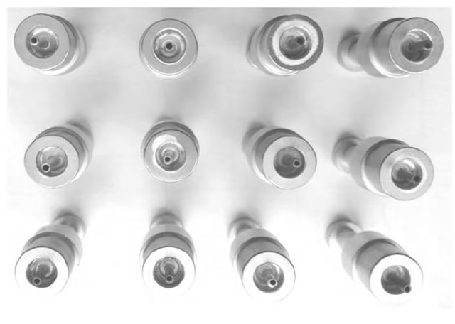 對(duì)于真空釬焊制作的釬焊件的密封性檢驗(yàn), 可以采用背壓法氦質(zhì)譜儀檢漏。試驗(yàn)樣件采用氧乙炔焰銀銅釬焊或氬弧焊等方法將釬焊件兩端開(kāi)口封住, 再進(jìn)行壓力充氦和氦質(zhì)譜儀檢漏。氦漏率一般要求<4×10Pa·m/s。