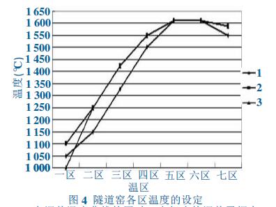(1)各區(qū)溫度的設(shè)定,滿足1150℃~1450℃相對較快升溫,快速通過燒成收縮相對較小的階段,1450℃~1600℃較慢升溫,保證燒成收縮較大的溫區(qū)溫度梯度較小,在降低燒成時間的同時,解決了燒成中期開裂的問題。