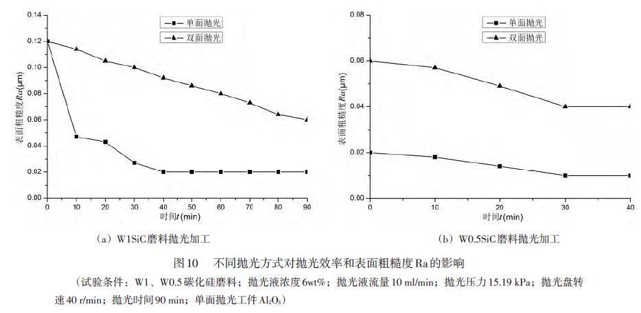 對于單面拋光方式能更高效率地使氧化鋁研磨片獲得更低的表面粗糙度Ra,其原因可以認(rèn)為是:一方面,磨料顆粒在進(jìn)入工件拋光區(qū)域前,可能會發(fā)生團(tuán)聚使磨粒變大,進(jìn)而對工件產(chǎn)生損傷使表面粗糙度Ra上升。而在單面拋光過程中,磨料顆粒在進(jìn)入拋光區(qū)域前需要經(jīng)過修整環(huán),修整環(huán)除了對陶瓷貼盤進(jìn)行定位,還通過自身壓力對產(chǎn)生團(tuán)聚的磨料進(jìn)行分離破碎,使磨料保持均勻粒徑對工件進(jìn)行拋光。因此在同種磨料的情況下,單面拋光方式能獲得更低的工件表面粗糙度Ra。另一方面,單面拋光是通過拋光盤和圓形陶瓷盤轉(zhuǎn)動(dòng)完成加工運(yùn)動(dòng)的,該運(yùn)動(dòng)產(chǎn)生的工件跳動(dòng)較小,磨料對工件的去除效率較高,產(chǎn)生的表面損傷較少;而雙面拋光是工件裝夾在游星輪保持架內(nèi),通過中心軸齒輪和外圈齒的嚙合在上下拋光盤間做游星運(yùn)動(dòng),該運(yùn)動(dòng)由于齒輪嚙合產(chǎn)生的工件跳動(dòng)較大,磨料對工件的去除效率較低,產(chǎn)生的表面損傷較多。因此,通過單面拋光方式獲得相同或更低表面粗糙度Ra所需要的時(shí)間更少。