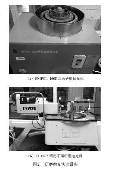 采用UNIPOL-160D雙面研磨拋光機(jī)(簡稱雙面研磨機(jī))和KD15BX精密平面研磨拋光機(jī)(簡稱單面研磨機(jī))(如圖2所示)對氧化鋁陶瓷基片進(jìn)行雙面和單面研磨、拋光工藝試驗(yàn),優(yōu)化研磨減薄工藝和拋光工藝。雙面研磨拋光加工時(shí),工件采用游星輪保持架裝夾,采用KD15BX精密平面研磨拋光機(jī)加工時(shí),工件通過石蠟黏貼到陶瓷盤上并正對研磨盤進(jìn)行加工。
