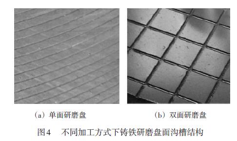 由圖3同時(shí)可以看出,單面研磨的工件材料去除率和表面粗糙度Ra均比雙面研磨高(而金剛石的材料去除率變化尤為明顯,單面研磨是雙面研磨的四倍),這可能與研磨盤溝槽的形狀有關(guān),如圖4所示。圖4(a)所示是單面研磨盤面采用的是細(xì)密的環(huán)形溝槽,這種結(jié)構(gòu)的溝槽能夠較大程度地使研磨液保留于研磨盤面上而不逸出,在相同的研磨液流量下則有更多的磨料顆粒作用于研磨工件,使得研磨后表面材料去除率較高;而雙面研磨盤面采用的是寬大的十字溝槽,如圖4(b)所示,這種結(jié)構(gòu)的溝槽使得大部分磨料填充于溝槽內(nèi)部并隨研磨盤的轉(zhuǎn)動(dòng)而逸出研磨作用區(qū)域,只有少部分磨料作用于研磨盤面與研磨工件之間,因此在相同的研磨液流量下則有較少的磨料顆粒作用于工件,使得研磨后表面材料去除率較低。同時(shí),單面研磨采用的鑄鐵盤硬度比雙面研磨的鑄鐵盤要低,磨粒更容易在研磨盤發(fā)生鑲嵌而產(chǎn)生二體摩擦研磨行為,從而導(dǎo)致單面研磨的材料去除率更高。因此,單面研磨的加工方式更適合對氧化鋁陶瓷基片進(jìn)行快速減薄加工。