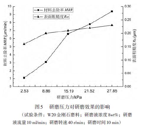 當(dāng)磨料粒徑越小時(shí),同一時(shí)間內(nèi)在研磨區(qū)域內(nèi)的磨料顆粒數(shù)量越多,且大小顆粒較為不明顯使得均勻性相對較好,在相同總壓力下每個(gè)受力顆粒的分壓則越小,對陶瓷表面的切深也越小,甚至僅去除表面的原始凸起,因此材料去除率較低但表面質(zhì)量較好。所以,本實(shí)驗(yàn)分別選用粒度為W40、W20和W5的金剛石磨料作為粗研磨、半精研磨和精研磨的磨料。