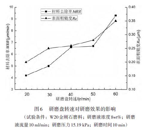 在不同的研磨盤轉(zhuǎn)速下,采用W20金剛石磨料對氧化鋁陶瓷進(jìn)行單面研磨實(shí)驗(yàn),結(jié)果如圖6所示??梢姡S著研磨盤轉(zhuǎn)速的提高,材料去除率和表面粗糙度Ra均呈增大趨勢,當(dāng)轉(zhuǎn)速為60r/min時(shí),去除率較高,但基片表面Ra也較高。這是因?yàn)殡S著研磨盤轉(zhuǎn)速的提高,磨料顆粒在單位時(shí)間內(nèi)作用于工件的軌跡變多,則單位時(shí)間內(nèi)磨粒對工件的去除量增加,去除率就提高;同時(shí)隨著轉(zhuǎn)速的提高,研磨盤的振動(dòng)加大,以及磨粒在研磨盤和工件間的分布不均勻,使得工件表面去除不均勻,進(jìn)而表面粗糙度Ra增加。從試驗(yàn)結(jié)果可以看出,為了保證較高去除量的同時(shí)表面粗糙度Ra較小,研磨轉(zhuǎn)速適宜選用40~50r/min。