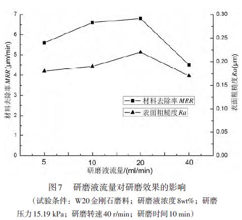 在不同的研磨液流量下,采用金剛石磨料對氧化鋁陶瓷進(jìn)行單面研磨實(shí)驗(yàn),結(jié)果如圖7所示??梢姡S著研磨液流量的增加,材料去除率和加工表面粗糙度Ra均先升高后降低,這是因?yàn)檠心ヒ毫髁康脑黾邮沟猛粫r(shí)間內(nèi)進(jìn)入研磨區(qū)域的磨料顆粒數(shù)量增加,材料去除率增加,當(dāng)研磨液流量增加至一定程度后,磨料顆粒在研磨區(qū)域內(nèi)的堆積使得磨粒間隙更小,磨粒更容易發(fā)生滾動(dòng),且一部分顆粒失去去除作用并逸出,剩下另一部分顆粒進(jìn)行去除作用,因此材料去除率下降,同時(shí)對陶瓷表面產(chǎn)生的損傷減小,表面粗糙度Ra減小。從試驗(yàn)結(jié)果可以看出,當(dāng)流量為10ml/min時(shí)的材料去除率與流量為20ml/min時(shí)材料的去除率相差很小,但表面質(zhì)量Ra相對好很多,所以適合選用流量為10ml/min的研磨液進(jìn)行單面研磨加工,也更節(jié)省磨料。