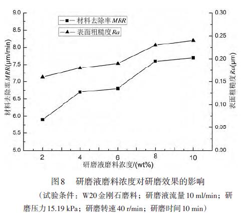 在不同的研磨液磨料濃度下,采用金剛石磨料對氧化鋁陶瓷進(jìn)行單面研磨實(shí)驗(yàn),結(jié)果如圖8所示??梢姡S著研磨液磨料濃度的增加,材料去除率和加工表面粗糙度Ra均有增加,研磨液磨料濃度大于8wt%時(shí),材料去除率趨于平緩。這是因?yàn)槟チ蠞舛容^少時(shí),磨粒主要發(fā)生二體摩擦研磨行為,隨著研磨液濃度的增加,參加加工的磨粒數(shù)量也增加,去除作用增強(qiáng),材料去除率升高。但隨著磨料濃度的增加,磨料逐漸轉(zhuǎn)變?yōu)槿w摩擦研磨行為,導(dǎo)致磨料去除率和表面粗糙度逐漸趨于飽和。因此,本實(shí)驗(yàn)的研磨液磨料濃度選用8wt%為宜,這樣既能節(jié)省研磨液成本,又能達(dá)到趨于相同的研磨效果。