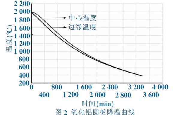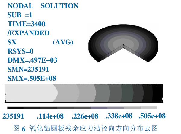 在快速降溫階段,不考慮蠕變的影響,在氧化鋁圓板徑向方向出現較大的溫度梯度見圖2,將圓板結 構分析與溫度分析進行耦合計算見圖3。這種熱應力為瞬態(tài)熱應力,隨著溫度梯度的降低而逐漸減小。 對于工業(yè)大尺寸陶瓷的燒結, 燒成溫度遠高于 蠕變起始溫度, 在快速降溫階段需考慮蠕變對溫度 場和應力場的影響。將蠕變與熱應力進行高溫段耦 合分析,見圖4。