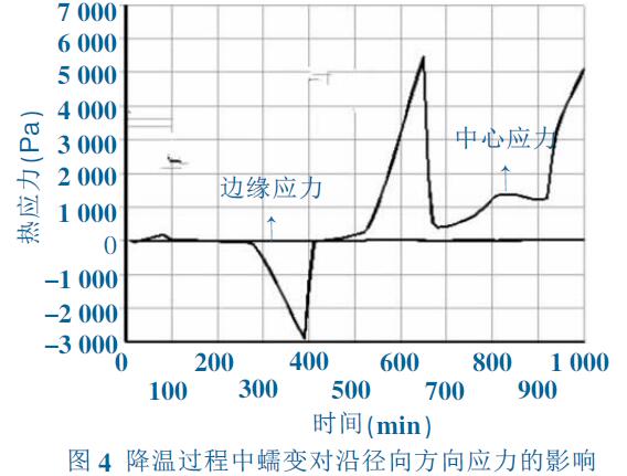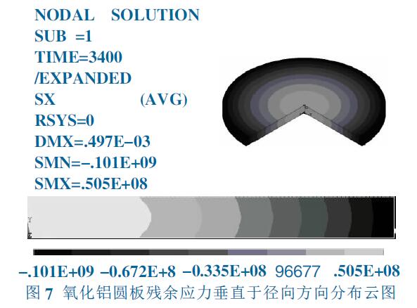 本文采用ANSYS 軟件,對降溫過程進行熱應力 分析,并考慮氧化鋁高溫蠕變造成的應力松弛,引入 隱性蠕變模型對整個降溫過程應力的形成進行計算 分析。通過模擬降溫制度對殘余應力的影響,得出: 大尺寸氧化鋁板在高溫段由于蠕變造成應力松弛, 使得圓板內部存在溫度梯度而沒有熱應力伴生;降 溫完成后溫度梯度消失,松弛的應力發(fā)生反轉,導致 殘余應力的出現。殘余應力沿徑向方向主要為拉應 力,且中心部位達到較大為50.5MP;殘余應力垂直 于徑向方向分布復雜, 表現為外部為壓應力(- 101MP),內部為拉應力(50.5MP)。