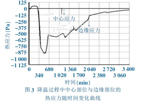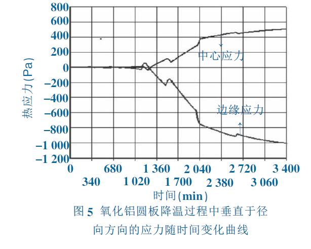 圖4 和圖5 為降溫過程中中心部位和邊緣部位 的應力隨時間變化,在勻速降溫初期,中心與邊緣存 在較大的溫度梯度(>100℃,見圖5),但由于高溫蠕 變造成應力馳豫, 圓板在蠕變范圍內沒有出現較大 應力σ=σ0≈0。隨著勻速降溫時間增加,內外溫度梯 度逐漸降低,即內部溫度變化量Tin> Tout,因而體積收縮Vin>Vout,在熱膨脹系數作用下,內部收縮遠大于 外部收縮βin>βout,從而產生較大的熱應力σ=E(βin- βout)。由于氧化鋁蠕變量與溫度成指數關系,對溫度 變化很為敏感,低溫(<1 500K)時幾乎沒有蠕變的產 生,不能消除降溫段溫度梯度減小而產生的熱應力。 從而使熱應力隨溫度梯度降低而逐漸增大。當內外 溫度趨于一致時, 應力達到較大值σt=σ0+E (βin- βout),導致燒成后圓板內部存在較大的殘余應力。