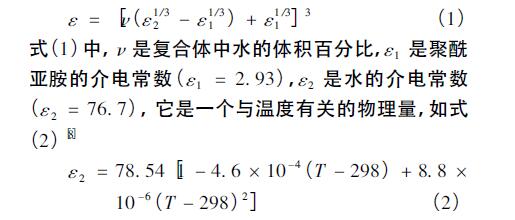 基于氧化鋁陶瓷無(wú)線無(wú)源濕度傳感器采用聚酰亞胺薄膜作為濕敏材料。聚酰亞胺在-200~260℃的范圍內(nèi)具有穩(wěn)定的化學(xué)性能、物理性能及介電性能;同時(shí)具有耐高溫、耐輻射、耐磨、尺寸穩(wěn)定、易于改性等特點(diǎn)。聚酰亞胺的介電常數(shù)約為2.9左右,蒸餾水的介電常數(shù)約為76.7,當(dāng)環(huán)境中水分子的濃度發(fā)生改變時(shí),聚酰亞胺薄膜吸附的水分子量變化,導(dǎo)致其介電常數(shù)改變。當(dāng)聚酰亞胺吸收水分子后,根據(jù)Looyenga關(guān)系式,可得到聚酰亞胺和水組成的復(fù)合體系的介電常數(shù)表達(dá)公式。