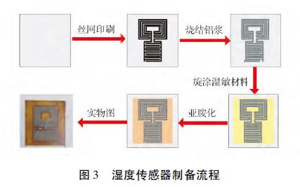 傳感器制備過(guò)程主要分為四步,首先采用絲網(wǎng)印刷技術(shù)在氧化鋁陶瓷上用無(wú)鉛鋁漿印刷設(shè)計(jì)好的電感線圈和又指電容圖形;然后在高溫爐中對(duì)印刷好的圖形按照燒結(jié)曲線進(jìn)行燒結(jié);接著利用勻膠機(jī)在又指電容和電感線圈表面旋涂一層均勻的聚酰亞胺薄膜;較后在氮?dú)鈿夥罩袑?duì)聚酰亞胺薄膜層進(jìn)行亞胺化處理。具體的制備流程如圖3所示。