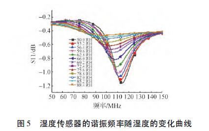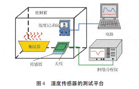 圖4為搭建的濕度傳感器測(cè)試平臺(tái)。該平臺(tái)由密封箱、加濕器、濕度記錄儀、電腦和網(wǎng)絡(luò)分析儀組成。加濕器、傳感器、天線和濕度記錄儀放置在密封箱內(nèi),電腦與濕度記錄儀相連,實(shí)時(shí)監(jiān)測(cè)溫度和濕度的變化。天線放置在濕度傳感器正上方10mm處,并且與外界的網(wǎng)絡(luò)分析儀相連。