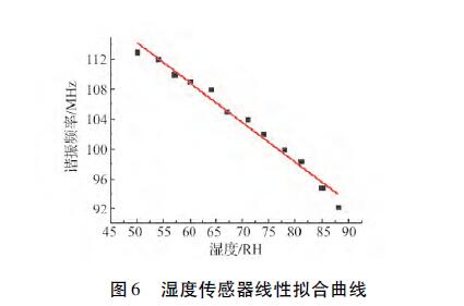 從50%RH變化到88%RH時(shí),溫度從30℃變化到33℃,也就是說(shuō),溫度對(duì)濕度傳感器的諧振頻率影響很小,可忽略不計(jì)。
