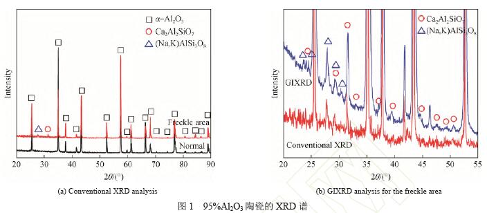 采用掠入射X射線衍射技術、飛行時間–二次 離子質譜儀技術并結合SEM/能譜儀對95%氧化鋁陶 瓷表面暗斑的未知相、形貌、成分進行表征,并分 析了陶瓷表面暗斑區(qū)第二相的析出原因。