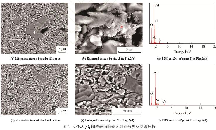綜上所述,暗斑區(qū)Si、Ca 含量的減少以及K、 Na 和Fe 的富集促進了Ca2Al2SiO7 和(Na,K)AlSi3O8 的 形成與析出。易顯色的Fe元素的富集對于95%氧化鋁陶瓷表面暗斑的產(chǎn)生起到了重要作用。