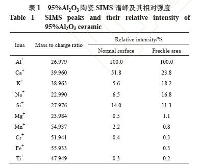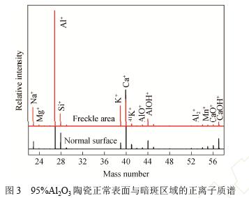 圖3 為95%氧化鋁陶瓷表面正常區(qū)域與暗斑區(qū) 域的正離子質譜??梢?,95%氧化鋁陶瓷的主要成分 包括Al、Ca、Si、K、Na 以及處于負離子狀態(tài)的O 元素。對于試樣正常表面,各正離子峰按相對強度 大小分別為Al+、Ca+、Si+、Na+和K+;而對于暗斑 區(qū)域,各正離子峰按相對強度高低分別為Al+、Ca+、 K+、Na+和Si+,即暗斑區(qū)K+和Na+含量明顯增加, Si+和Ca+含量減少。