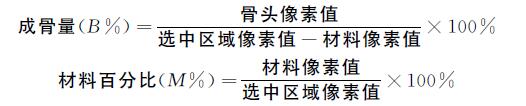 為了組織形態(tài)學分析,切片首先用掃描儀(Dimage Scan?。牛欤椋簦濉。担矗埃埃桑?,Japan)掃描,然后用PhotoshopCS5 處理圖片,讀出選中區(qū)域、材料、骨頭三者的像素值,根 據(jù)公式