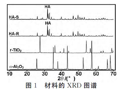 材料的XRD圖譜如圖1所示。由圖1可知,HAS 和HA-R在不同溫度燒結(jié)(HA-S,1250℃;HA-R, 1100℃),但它們的特征峰與標準羥基磷灰石一致。 TiO2 在2θ=27.6,36.28,41.4,54.5,56.78和69.16°有 明顯的特征衍射峰,與r-TiO2 的XRD 標準峰一致。