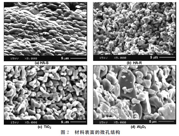 從圖1可知,1 250℃燒結(jié)后,HA晶體熔融在一起,導致HA-S形成較光滑的表面(圖2(a)),但是 1?。保埃啊鏌Y(jié)的HA-R表面有豐富的微孔(圖2(b))。 TiO2 表面同樣可以看到豐富的微孔(圖2(c))。在 1 300℃下,很少氧化鋁 晶體(細微顆粒)熔融,顆粒堆 疊在一起形成微孔(圖2(d))。BET 無法檢測HA-S 表面積,HA-R的表面面積為0.777m2/mL,TiO2 的 表面面積為0.102m2/mL,氧化鋁 為0.206m2/mL(表 1)。4種不同的微孔表面結(jié)構,材料的表面積不同。