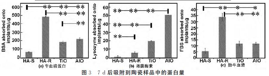 浸泡7d后,不同材料吸附溶菌酶素(lysozyme) 的能力各不相同(圖3(b))。氧化鋁 能吸附溶菌酶素 較多,HA±S吸附較少。HA±S吸附(1±1)μg(占總 量(2±2)%),HA±R 吸附(6±1)μg(占總量(10± 2)%)。TiO2 吸附(20±1)μg(占總量(33±1)%)。