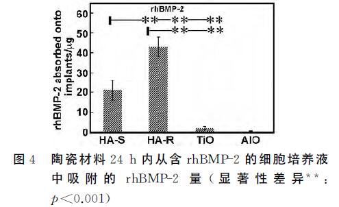 浸泡24h后,HA-S吸收(21.4±4.6)ng?。颍瑁拢停校?(占總量的(1.40±0.33)%),HA-R 吸收(42.9±5.3)ng?。颍瑁拢停校玻ㄕ伎偭康模ǎ玻福?plusmn;0.33)%),TiO2 吸收 (2.2±0.8)ng rhBMP-2(占總量的(0.13±0.06)%), 氧化鋁 吸附(0.4±0.2)ng?。颍瑁拢停校玻ㄕ伎偭康模ǎ埃埃?plusmn; 0.01)%)。這個結(jié)果驗證了鈣磷陶瓷對BMP有較強 的親和力,但結(jié)果也同時顯示TiO2 和氧化鋁 陶瓷對 rhBMP-2的吸附能力很弱。