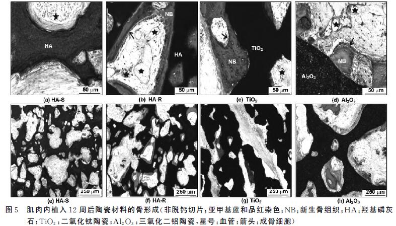 肌肉種植12周后,所有HA-R,TiO2,氧化鋁 植入 體都有骨組織生成,但在HA-S中沒有骨生成(表1)。 在HA-S里只發(fā)現(xiàn)纖維組織和血管(圖5(a),(e))。除 了纖維組織和血管外,在HA-R的大孔表面還發(fā)現(xiàn)有 礦化的骨組織(圖5(b),(f))。與HA-R 類似,TiO2 (圖5(c),(g))和氧化鋁(圖5(d),(h))大孔中有纖維 組織,血管和新生骨組織。