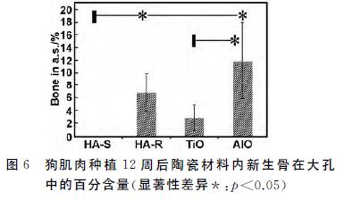 組織形態(tài)定量分析總結(jié)在圖6和表1,陶瓷種植 體具有不同材料百分比。HA-S中材料占(50.7± 2.8)%,HA-R中材料占(52.4±5.1)%,TiO2 中材料 占(63.5±13.3)%,氧化鋁 中材料占(63.5±10.2)%。 樣品中的成骨量也有差異。HA-R中成骨量為(7.6± 3.0)%,TiO2 中成骨量為(1.9±1.0)%,氧化鋁 中成骨量 為(12.1±5.6)%。由于制備陶瓷的材料百分比不同 (表1),陶瓷有不同的孔隙率,因而無法排除大孔孔隙 率對成骨量的可能影響。但單從新骨發(fā)生率的不同, 可以討論材料因素在生物材料骨誘導中的可能功能。